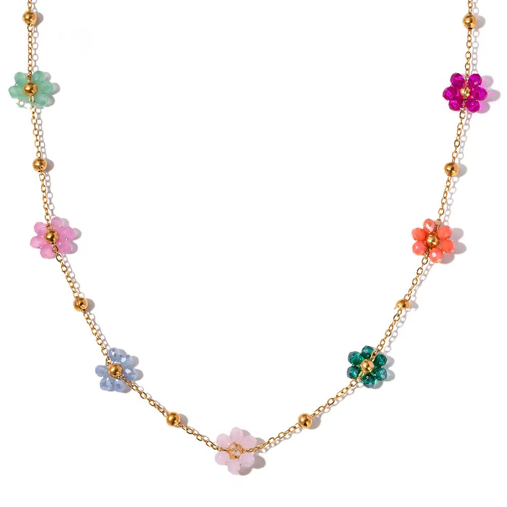 Ce collier fin et lumineux se pare de petites perles formant des fleurs colorées sur une chaîne dorée. Confectionné en acier inoxydable 18K, il résiste à l'eau, à l'oxydation et vous accompagne au quotidien avec fraîcheur et fantaisie.