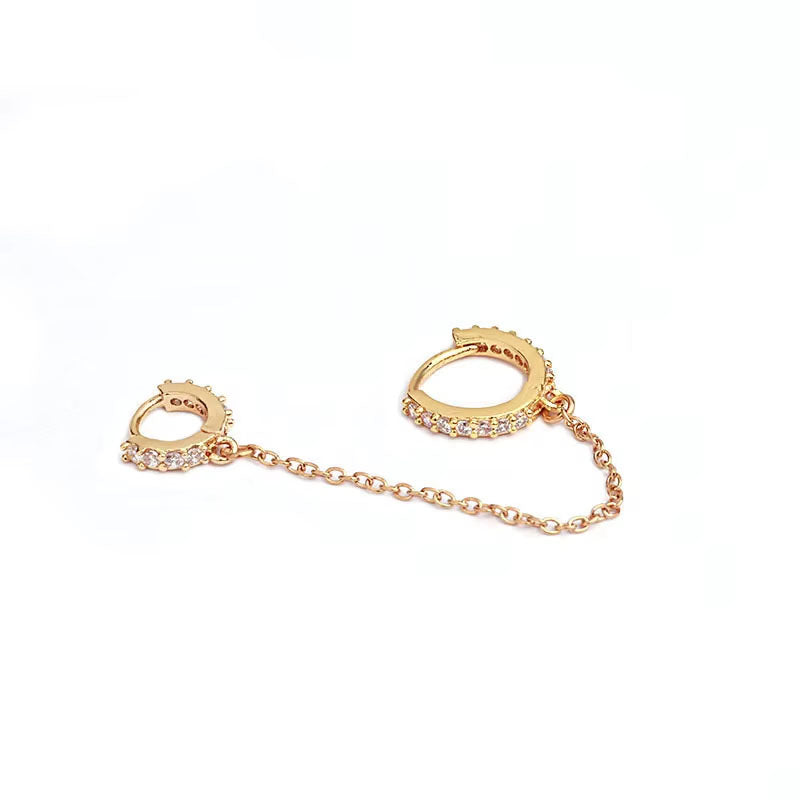 Deux petites créoles de taille différente en acier inoxydable doré 18k serties de strass étincelants, reliées par une fine chaînette. La pièce dispose de fermoirs à charnière sécurisés sur chaque anneau et présente une finition dorée brillante.