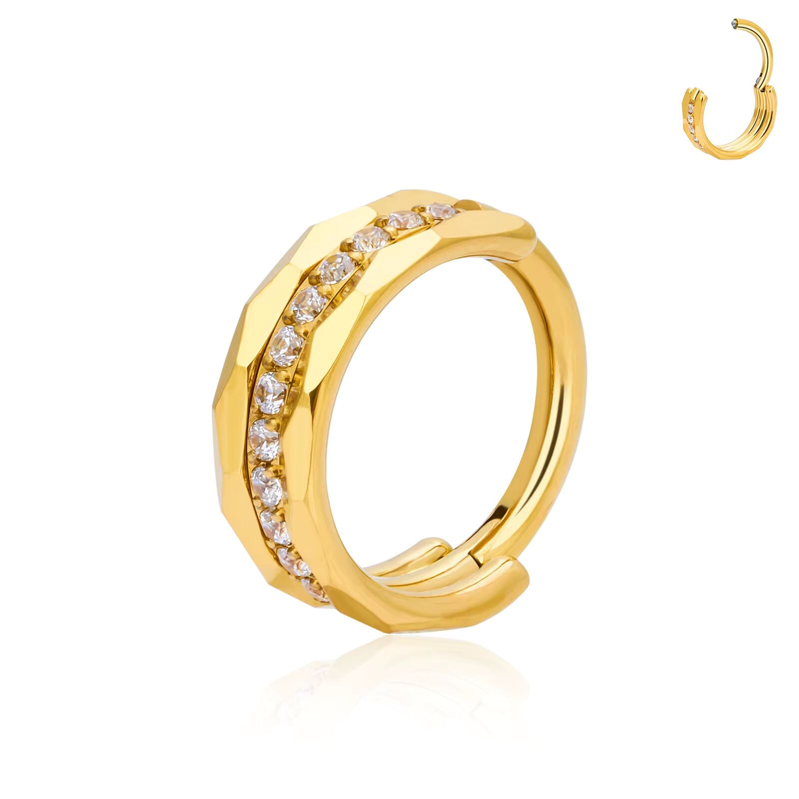 Ce piercing se distingue par sa surface dorée facettée et sa ligne centrale incrustée de strass scintillants. Moderne et luxueux, il apporte du relief tout en restant chic. Diamètre = 8mm