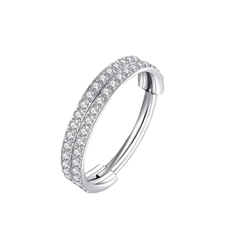 Élégant et sophistiqué, cet anneau argenté est entièrement serti de deux lignes de micro-strass scintillants. Un bijou raffiné au design luxueux, parfait pour illuminer avec discrétion le nez, l’oreille ou le cartilage. Diamètre = 8mm