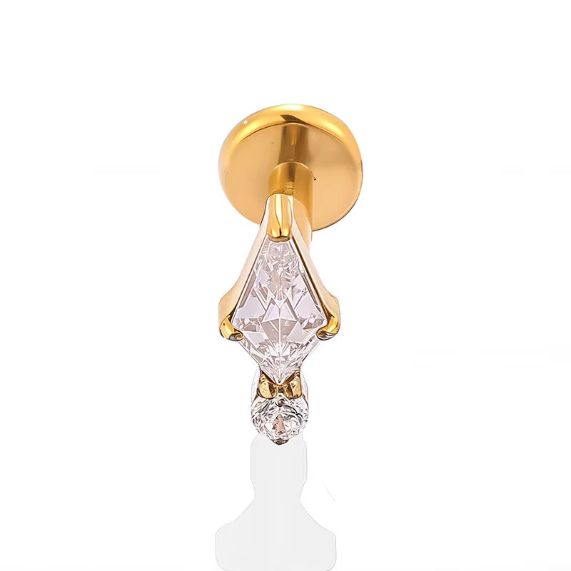 Élégant et raffiné, ce piercing labret en forme de goutte inversée est orné de deux cristaux taillés avec finesse. Idéal pour une touche précieuse sur l’oreille.