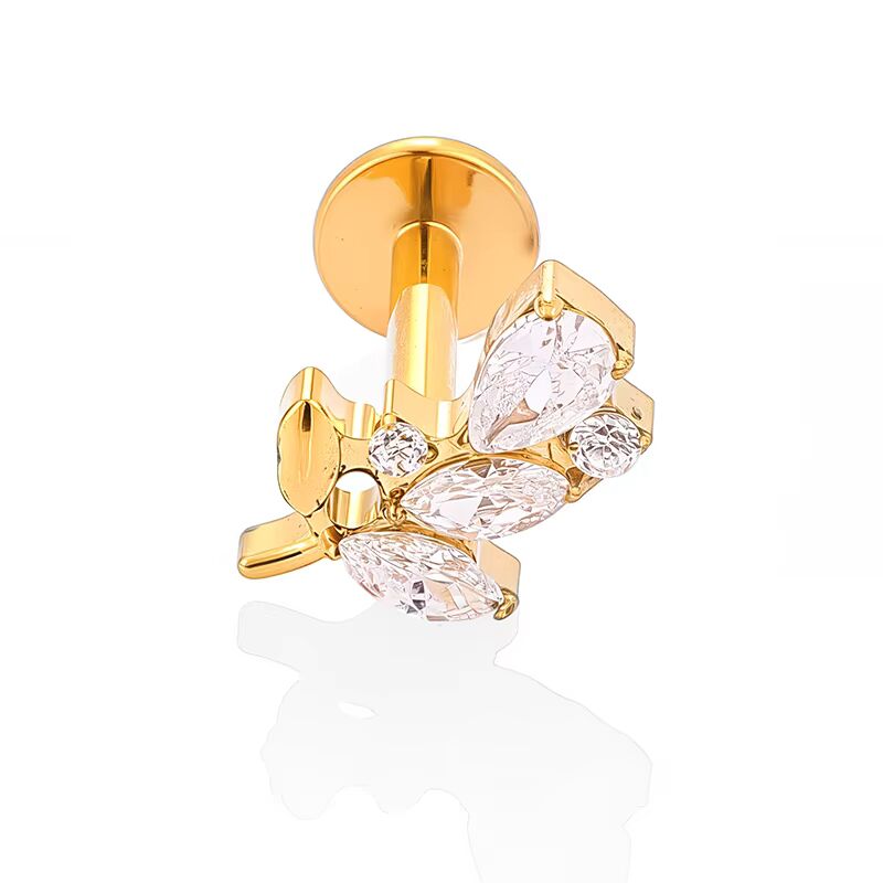 Un piercing labret doré en forme de bouquet élégant de pierres taillées variées pour un effet floral et étincelant unique.