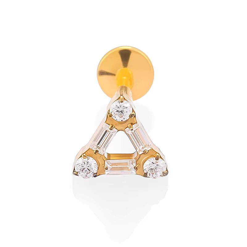 Un design géométrique chic avec une structure triangulaire formée de pierres baguette et rondes, ce labret doré offre un style moderne et sophistiqué. Parfait pour les amateurs de motifs architecturaux et symétriques.