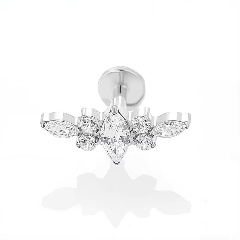 Inspiré de la nature, ce labret argenté évoque la silhouette stylisée d’un petit insecte ailé. Une pierre marquise centrale forme le corps, tandis que les pierres navettes et rondes de part et d’autre dessinent des ailes étincelantes. Le résultat ? Un bijou à la fois original, délicat et poétique, parfait pour les amateurs de motifs organiques et subtils.