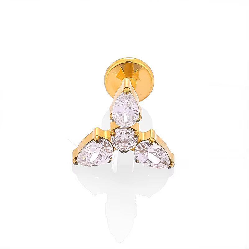 Composé de trois pierres en forme de goutte et de deux rondes, ce labret forme une pointe élégante orientée vers le bas. Son look chic et féminin en fait un accessoire parfait pour sublimer votre oreille.