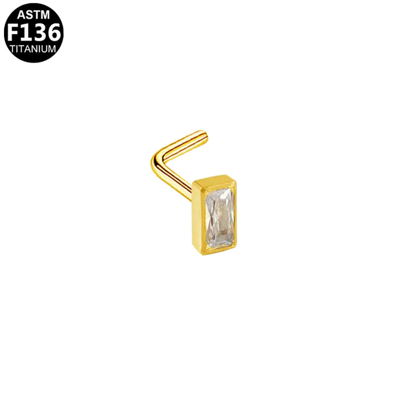 Piercing de narine en finition dorée avec un solitaire rectangulaire “baguette” serti clos (bord lisse et protecteur). La tige en L assure une tenue fiable tout en restant confortable.